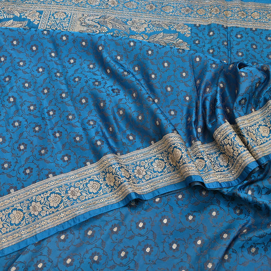 Vintage Banarasi Saree Pure Satin Silk Woven Brocade Zari Fabric Blue Heavy Craft Sari 5 Yards Indian Antique Textile Dress Making