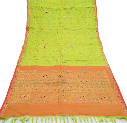 Indian Vintage Saree Heavy Hand Embroidered Pure Silk Green & Orange Bridal Fabric 5 Yards Dress Making Bollywood Sarees