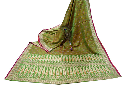 Indian Vintage Sari Green Heavy Pure Satin Silk Woven Banarasi Tanchoi Saree 5Yd Ethnic Craft Fabric Upcycle Bridal Heavy Sarees
