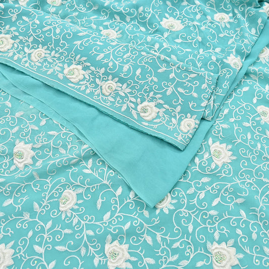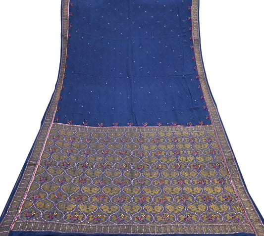 Indian Vintage Heavy Sari Blue Pure Crepe Silk Hand Embroidered Sarees Craft Fabric 6Yd Sewing Zardozi Dress making