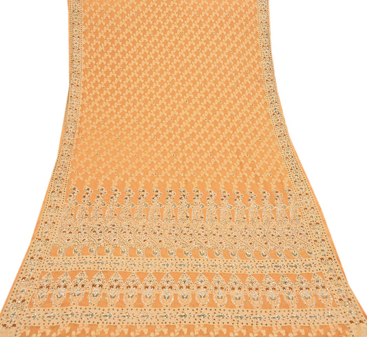 Indian Vintage Heavy Saffron Saree Georgette Hand Embroidered Sari Craft Fabric 6Yd Sewing Soft Ethnic Zari Dress Making wedding Sari