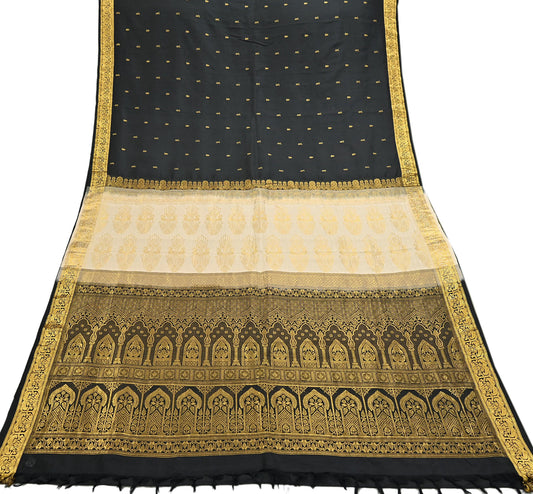 Indian Antique Vintage Black & Ivory Kanjivaram Saree Handwoven 100% Pure Silk Heavy Zari Work 5 Yards Craft Fabric for Sewing, Dressmaking