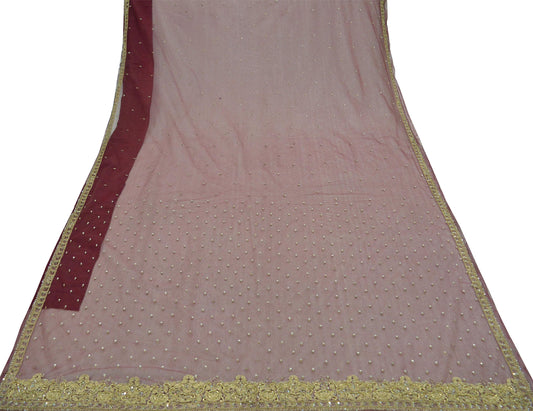 Indian Vintage Heavy Sari Maroon Pure Georgette Silk Hand Beaded Sarees Craft Fabric 5Yd Sewing Ethnic Zardozi/ Dabka Wedding Sarees