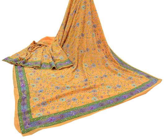 Indian Vintage Heavy Sari Saffron Pure Georgette Silk Hand Beaded Sarees Craft Fabric 5Yd Sewing Dress Making Ethnic Wedding Sarees Crafting
