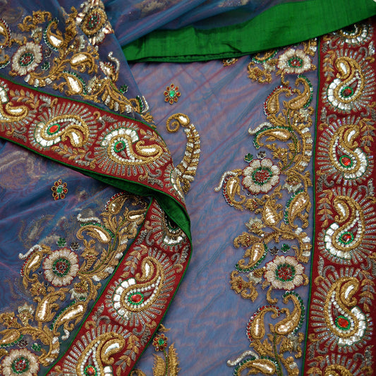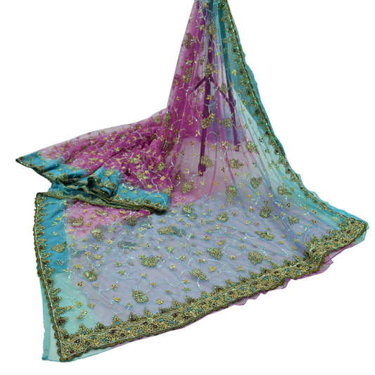 Indian Vintage Heavy Sari Purple & Blue Net/Mesh Hand Embroidered Sarees Craft Fabric 6Yd Sewing Soft Zardozi/Dabka Zari Wedding sari