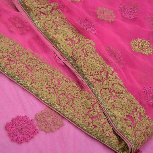 Indian Vintage Sari Pink Net/Mesh Hand Embroidered Sarees Ethnic Craft Fabric 6Yd Sewing Soft Zardozi/Dabka Zari Sequins Wedding Sarees