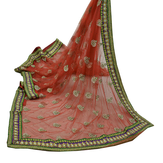 Indian Vintage Sari Red Net/Mesh Hand Embroidered Designer Lehenga Sarees Ethnic Craft Fabric Sewing Soft Zardozi/Dabka Zari Wedding Sarees