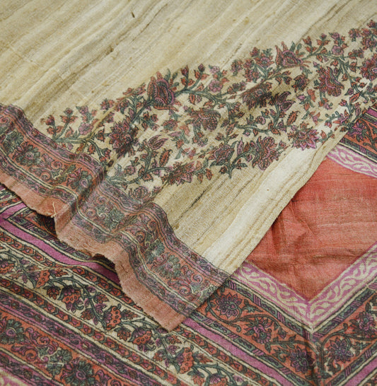 Indian Vintage Beige Saree Pure Khadi Silk Handloom Printed Indian Sari Fabric 6yard Ethnic Wear Floral
