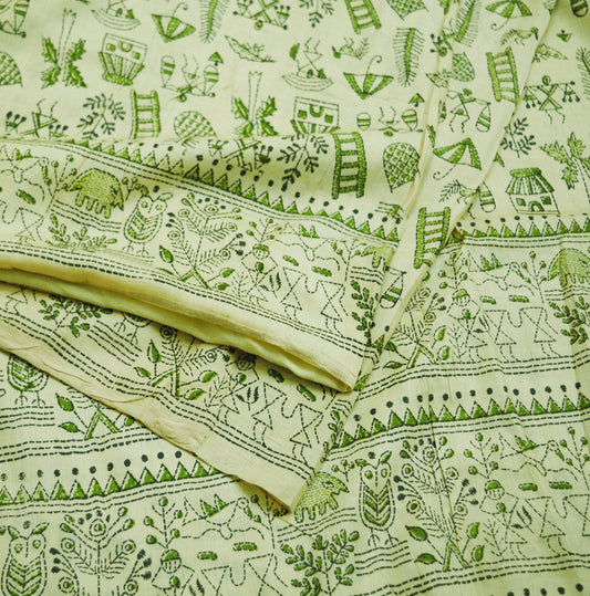 Indian Vintage Ivory Saree Pure Khadi Silk Handloom Warli Printed Indian Sari Fabric 5yard Ethnic Wear Sari Floral