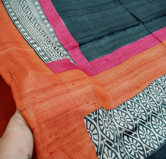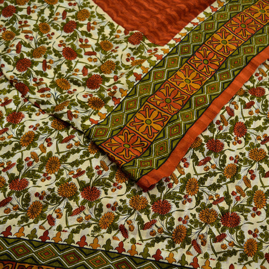Indian Vintage Orange & Ivory Saree Pure Khadi Silk Handloom Printed Sari Craft Fabric 6yd Ethnic Wear Dress making Crafting Quilting