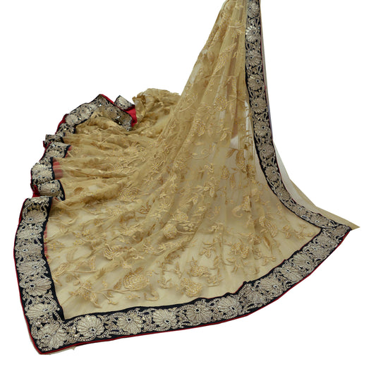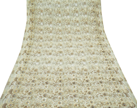 Indian Vintage Beige Wedding Saree Net/Mesh Embroidered Sari Fabric Floral 6Yd Lace Soft Dressmaking Zardozi Bridal Bollywood Saree