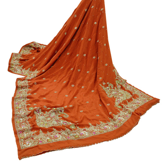 Indian Vintage Heavy Sarees Orange Pure Georgette Silk Hand Embroidered Sari Fabric 5Yd Sewing Ethnic Zardozi/dabka zari Wedding sarees