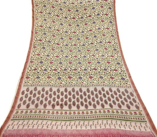 Indian Vintage Saree Pink & Beige Pure Woolen Woven Printed Sari Soft Warm Fabric 5Yard Floral Woven Border