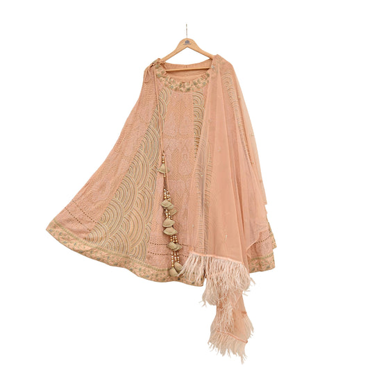 Pre-Owned Designer Anamika Khanna Hand Embroidered Lehenga & Dupatta Set Maroon Velvet Skirt with Peach Net Dupatta