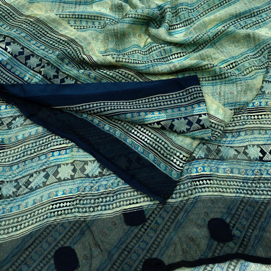 Indian Vintage Sari Ivory & Blue Pure Chiffon Silk Printed Sarees 6Yd Craft Fabric Sewing Soft Dress Making Upcycle Quilting