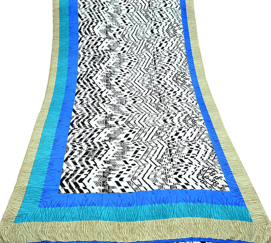 Indian Vintage Sari White & Black Pure Crepe Silk Mukesh Work Printed Sarees 5yd Sewing Craft Fabric Ethnic Upcycle Dress Making Quilting