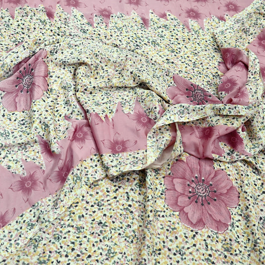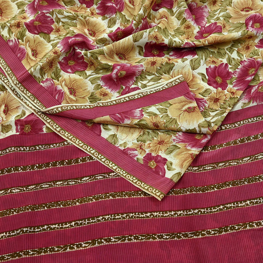 Indian Vintage Sari Ivory & Pink Moss Crepe Printed Sarees 5yd Craft Fabric Sewing Floral Soft Dress making Quilting Crafting Upcycle Used