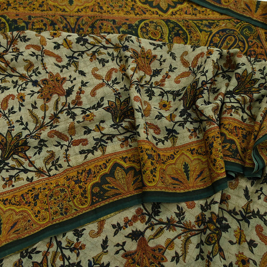 Indian Vintage Sari Beige & Green Pure Cotton Printed Sarees Craft Fabric Soft 5Yd Sarong Wrap Boho Fabric Kimono Quilting Crafting Upcycle