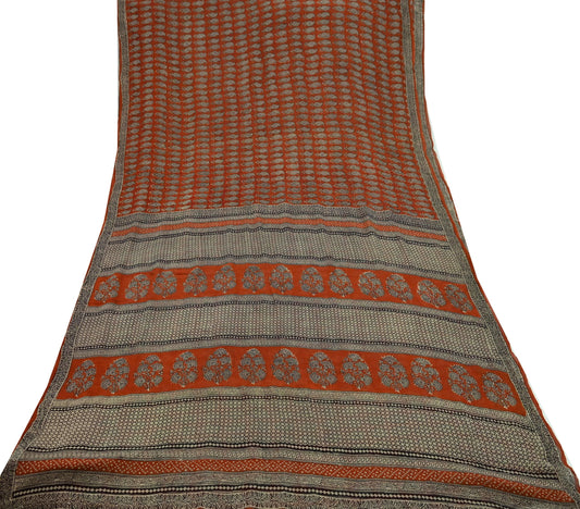 Indian Vintage Sari Orange & Brown Pure Chiffon Silk Printed Sarees Craft Fabric Sewing 5Yard Soft Light Sari Dress Making Quilting