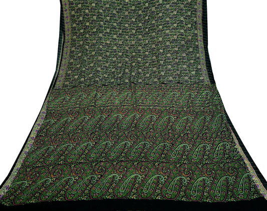 Indian Vintage Green & Black Saree Pure Georgette Silk Digital Printed Sari Sewing 5yd Craft Fabric Soft Floral Crafting Dress Making