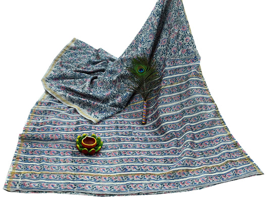 Indian Vintage Sari Pure chanderi Silk Bagru Printed Saree 5Yd Fabric Floral Soft Zari Border Ethnic Upcycle Crafting Dress making