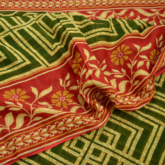 Indian Vintage Sari Green, Beige & Red Printed Pure Cotton Saree Craft Fabric 5Yd Sewing Sarong Wrap Boho Floral Crafting Upcycle Quilting