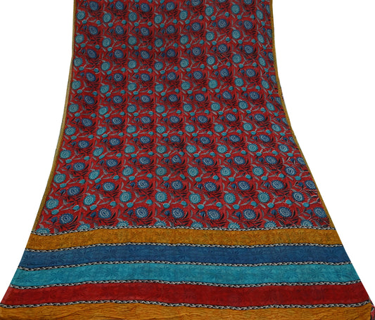 Indian Vintage Red & Blue Saree 100% Pure Georgette Silk Block Printed Sari Sewing 5yd Craft Fabric Dress Designing for Dress making