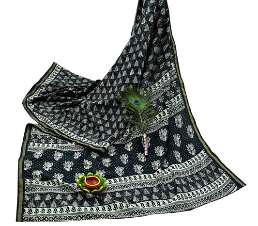 Indian Vintage Sari Black Pure chanderi Silk Bagru Printed Sarees Fabric 5Yd Floral Soft Golden Zari Border Ethnic Dress making Upcycle