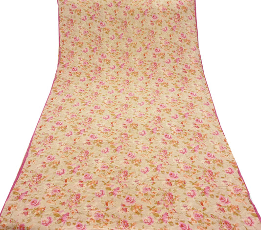 Vintage Sari Yellow & Pink 100% Pure Chiffon Silk Printed Sarees Sewing 5yd Craft Fabric Soft Dress Designing for Crafting Floral