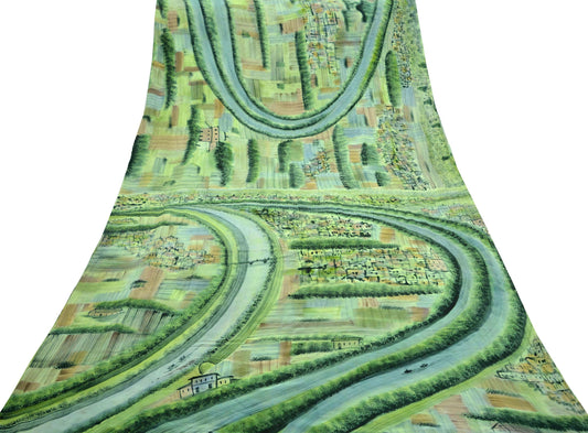 Women Vintage Saree Green & Saffron Pure Georgette Silk Printed Sari 6yd Craft Fabric Sewing Crafting Dress making Quilting Upcycle Used