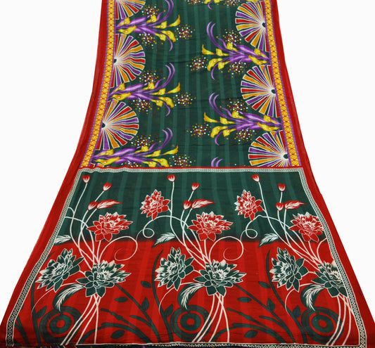 Indian Vintage Sari Green & Red Printed Pure Cotton Saree Craft Fabric 5Yd Sewing Sarong Wrap Boho Floral Crafting Upcycle Quilting Used