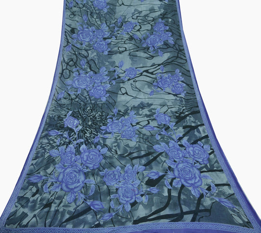 Indian Vintage Blue Saree Pure Crepe Silk Printed Sari 5yd Sewing Floral Soft Craft Fabric Wrap Dress making Crafting Quilting Upcycle