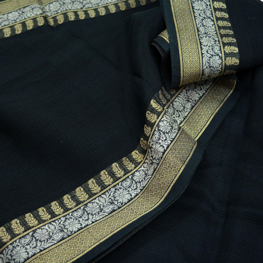 Indian Vintage Sari Black Pure chanderi Silk Block Printed Sarees Craft Fabric 5Yd Soft Zari Border Floral Dress making bollywood silk saree