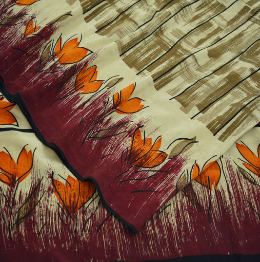 Indian Vintage Sari Beige & Maroon Pure Crepe Silk Printed Saree 5yard Sewing Floral Soft Craft Fabric Wrap