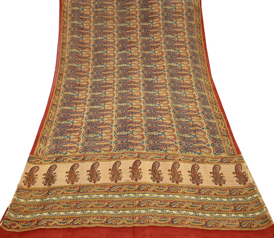 Indian Vintage Red & Beige Saree Printed 100% Pure Cotton Sari Craft Fabric 5Yd Soft Sewing Sarong Wrap Dress Making Quilting Crafting Zari
