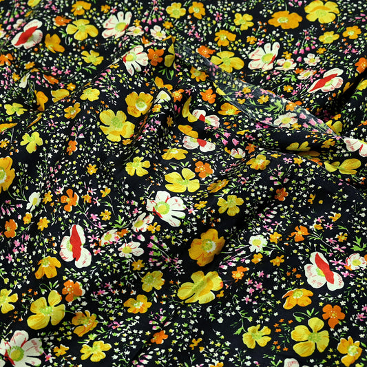 Indian Vintage Saree Beige & Black Moss Crepe Printed Sari | 5 Yards | Floral Soft Fabric for Sewing, Dressmaking, Crafting, Quilting