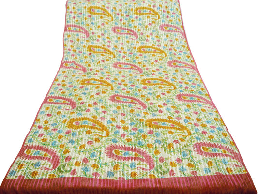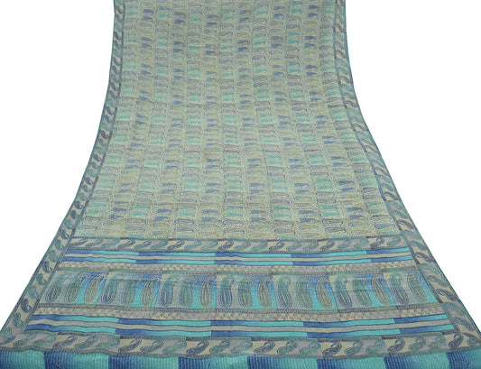 Indian Vintage Sari Beige & Green Pure Crepe Silk Printed Sarees 5yd Sewing Soft Craft Fabric Wrap Paisley Crafting Dress making Quilting
