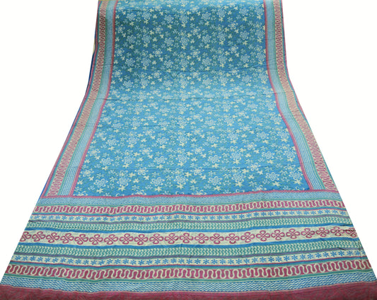 Indian Vintage Sari Blue & Green Pure Crepe Silk Printed Saree 5yard Sewing Floral Soft Craft Fabric Wrap