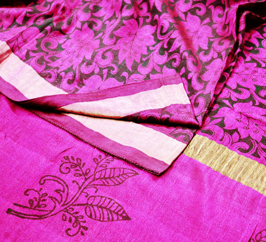 Vintage Sari Rani Pink 100% Pure Silk Printed Sarees Fabric 6yard Sewing Paisley Soft Dress Designing for Crafting