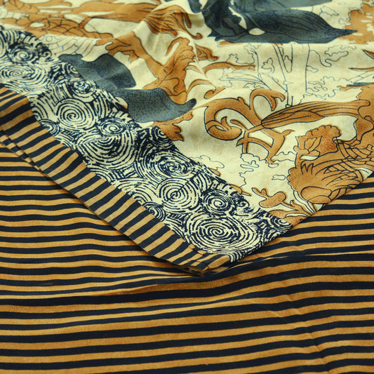 Indian Vintage Sari Ivory & Saffron Pure Crepe Silk Printed Saree 5yard Sewing Abstract Soft Craft Fabric Wrap