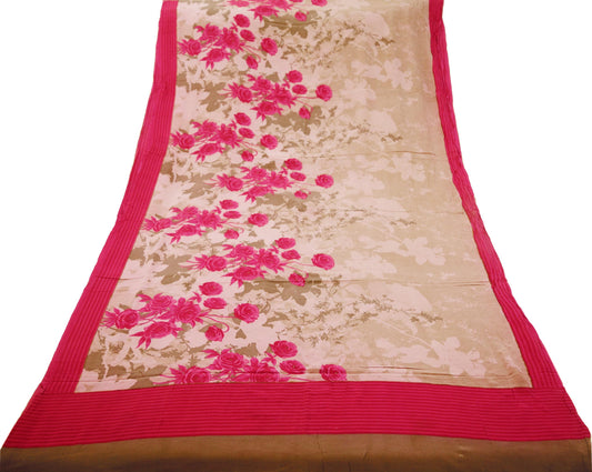 Indian Vintage Sari Beige & Pink Pure Crepe Silk Printed Saree 5yard Sewing Floral Soft Craft Fabric Wrap