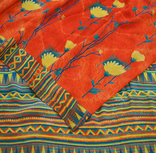 Indian Vintage Sari Orange & Red Pure Crepe Silk Printed Saree 5yard Sewing Floral Soft Craft Fabric Wrap