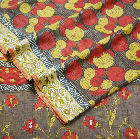 Indian Vintage Sari Brown & Red 100% Pure Silk Printed 5yard Sewing Craft Fabric DressMaking Soft