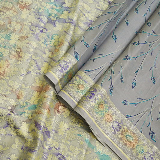 Indian Vintage Sari Gray Pure Silk Printed Saree Fabric 6yard Sewing Craft DressMaking Soft Abstract Decor