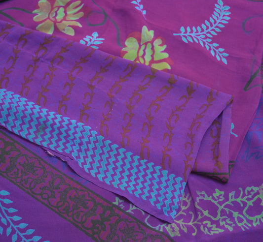 Indian Vintage Sari Purple Pure Crepe Silk Printed Saree 5yard Sewing Floral Soft Craft Fabric Wrap