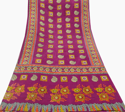 Indian Vintage Sari Purple Pure Crepe Silk Printed Saree 5yard Sewing Floral Soft Craft Fabric Wrap