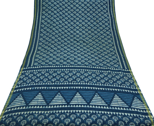Indian Vintage Sari Blue Pure Chanderi Cotton Hand Block Printed Sarees 5Yd Craft Fabric Soft Sewing Sarong Dress Making Quilting Crafting