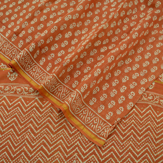 Indian Vintage Sari Orange & Beige Printed Chanderi Cotton Craft Fabric 5Yd Sewing Zigzag Soft Dress Making Bollywood sarees Crafting Zari