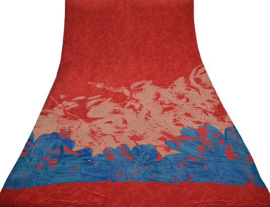 Indian Vintage Red & Blue Saree Pure Crepe Silk Printed Indian Sari 5yd Sewing Abstract Soft Craft Fabric Wrap Dress making Upcycle Quilting