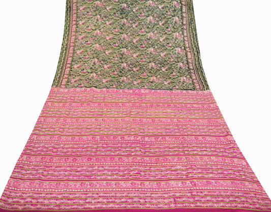 Indian Vintage Sari Green Pure Crepe Silk Printed Sarees 5yd Sewing Floral Soft Craft Fabric Wrap Dress Making Crafting Quilting Upcycle
